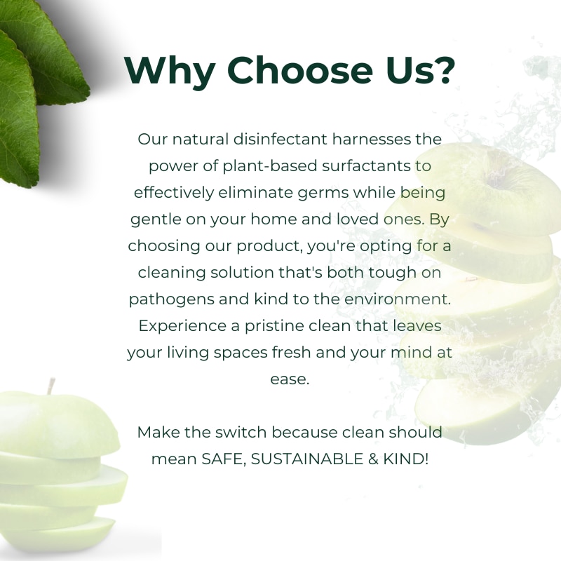 "Powerful Protection, Naturally!" Our natural disinfectant, formulated with plant-based surfactants, offers a powerful and eco-friendly cleaning solution. These natural surfactants ensures a safer choice for your home and the environment. They effectively break down and remove dirt, grease, and pathogens without the use of harsh chemicals, making our disinfectant tough on germs yet gentle on surfaces, children, and pets. By choosing our product, you're opting for a sustainable cleaning option that doesn't compromise on efficacy.
