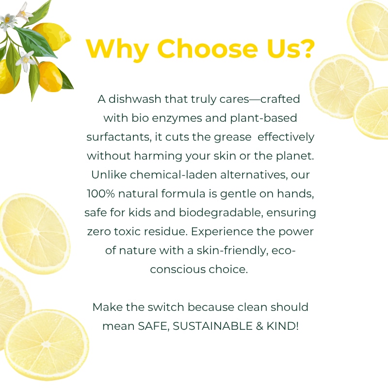 Your Kitchen Deserves Better. Your Family Deserves the Best. Introducing our Natural Dish Wash Liquid — a powerful yet gentle cleaner crafted from lemon bio enzyme, coconut-based surfactants, and IRFA-certified fragrance. No harsh chemicals. No toxic residues. Just the safest clean you can give your family. ✨ Why Choose Us? Tough on grease, gentle on hands Made with plant-based ingredients that are safe for you, your children, and even your furry friends Biodegradable & eco-friendly – what goes down your drain won’t harm the planet Lightly scented with certified safe fragrance, so your utensils smell fresh without synthetic overload 💛 When you wash your plates with this cleaner, you’re not just removing food – you’re removing worry. No more rinsing ten times to feel safe. No more wondering what’s left behind. You're choosing: Health over harshness Safety over shortcuts A cleaner home and a cleaner Earth 🌿 Switch today — because your family eats off those plates, and they deserve only the purest care.