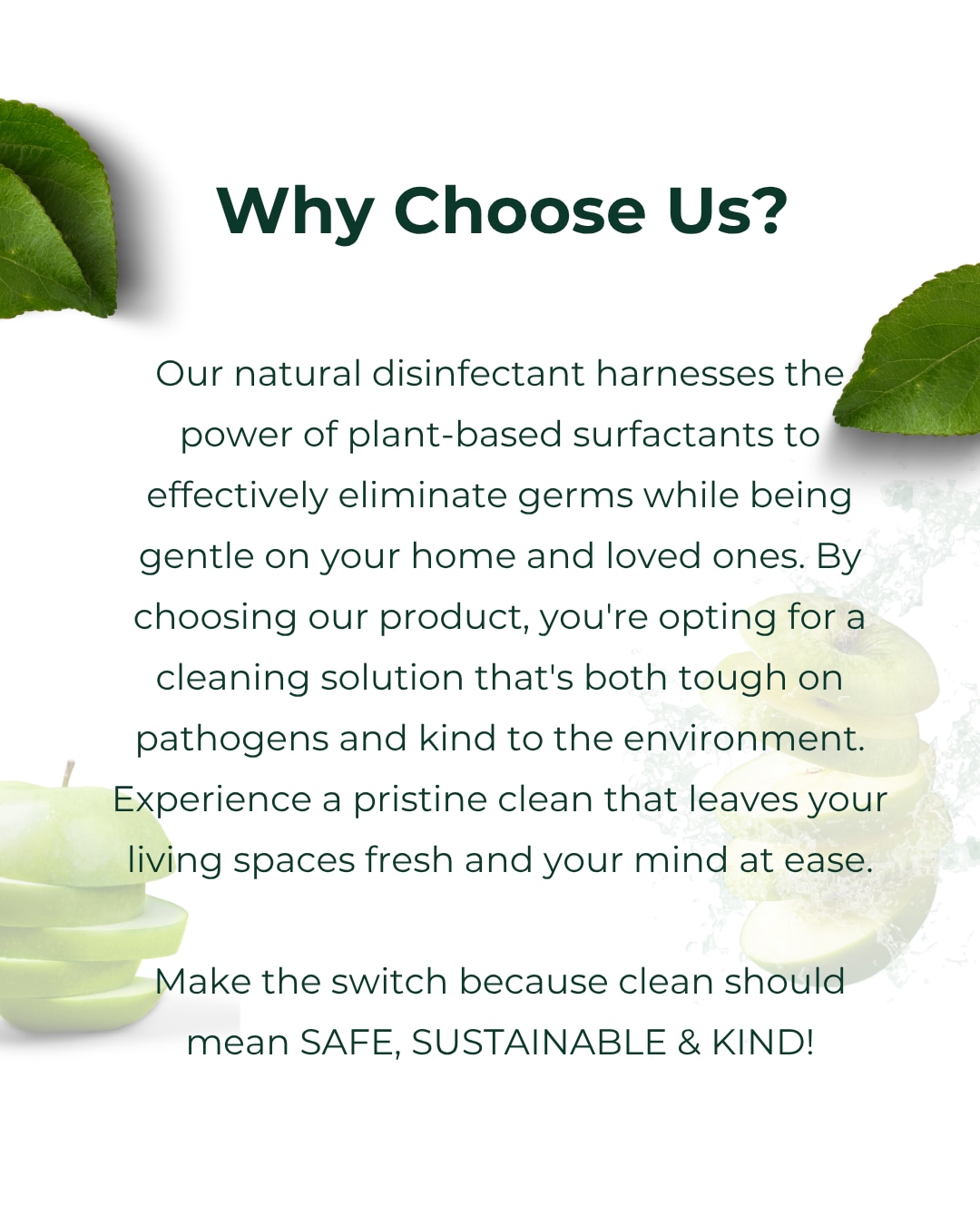 “Powerful Protection, Naturally!” Our natural disinfectant, formulated with plant-based surfactants, offers a powerful and eco-friendly cleaning solution. These natural surfactants ensures a safer choice for your home and the environment. They effectively break down and remove dirt, grease, and pathogens without the use of harsh chemicals, making our disinfectant tough on germs yet gentle on surfaces, children, and pets. By choosing our product, you're opting for a sustainable cleaning option that doesn't compromise on efficacy.